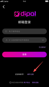 打开Dipal应用,点击“邮箱注册”按钮
